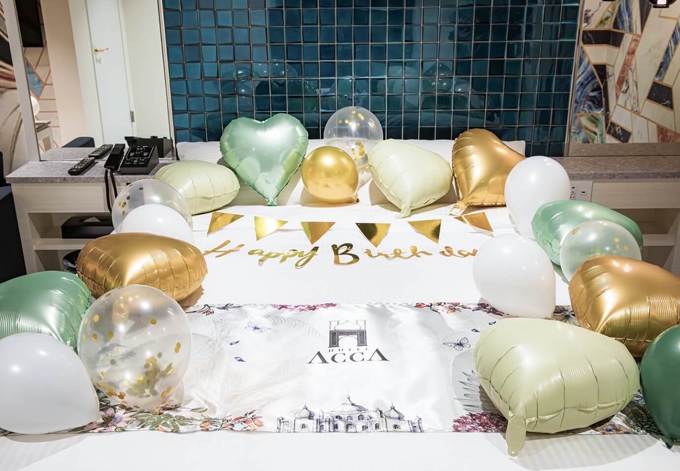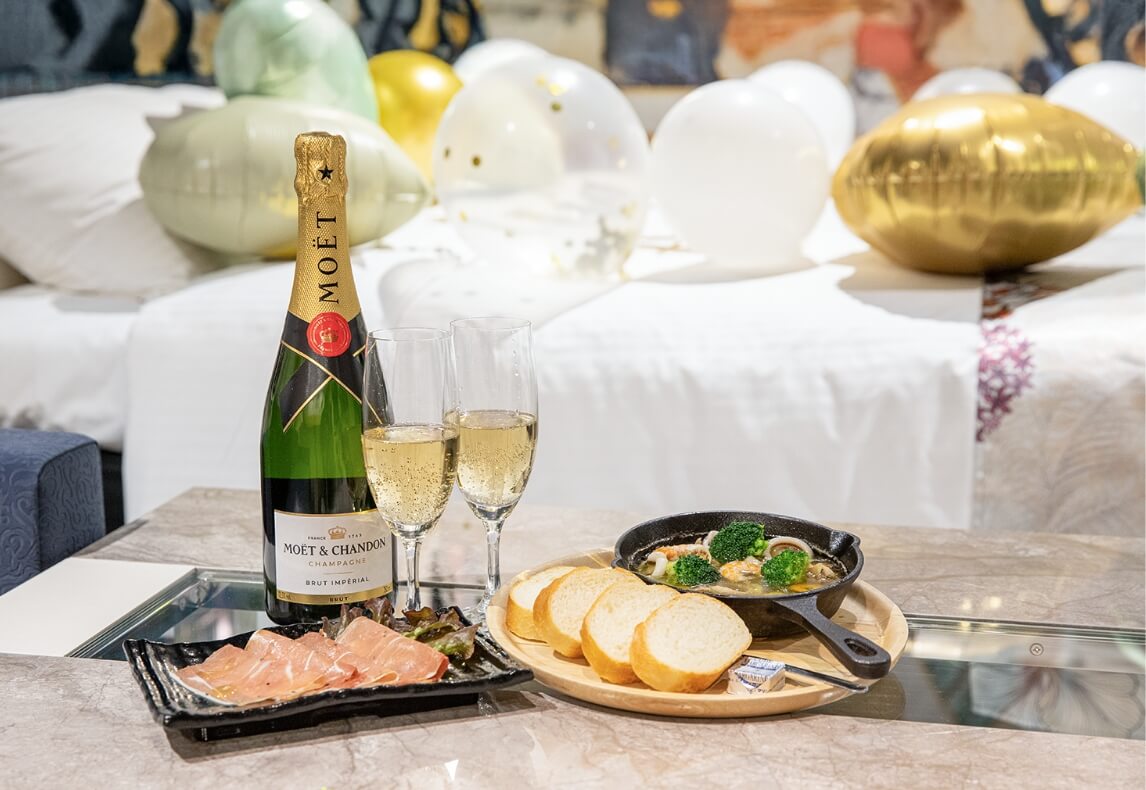 バルーンデコレーションが華やかに迎える客室で、シャンパンの泡が立つ音と共に、アフタヌーンティーやアラカルトで優雅に彩るアニバーサリー。