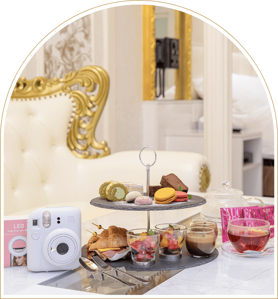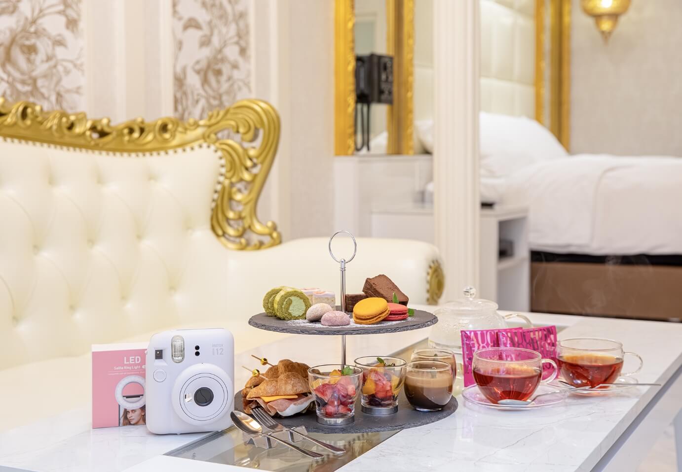 フォトジェニックな客室デザインと、華やかなティーセットが並ぶ贅沢時間。
