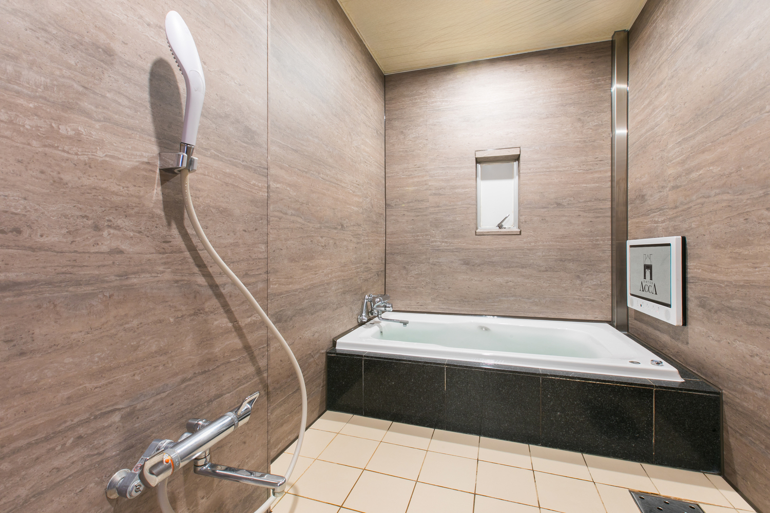 浴室テレビとジャグジー、頭皮や肌に優しいシャワーヘッドも完備。入浴中もTV鑑賞をお楽しみいただけます。 -