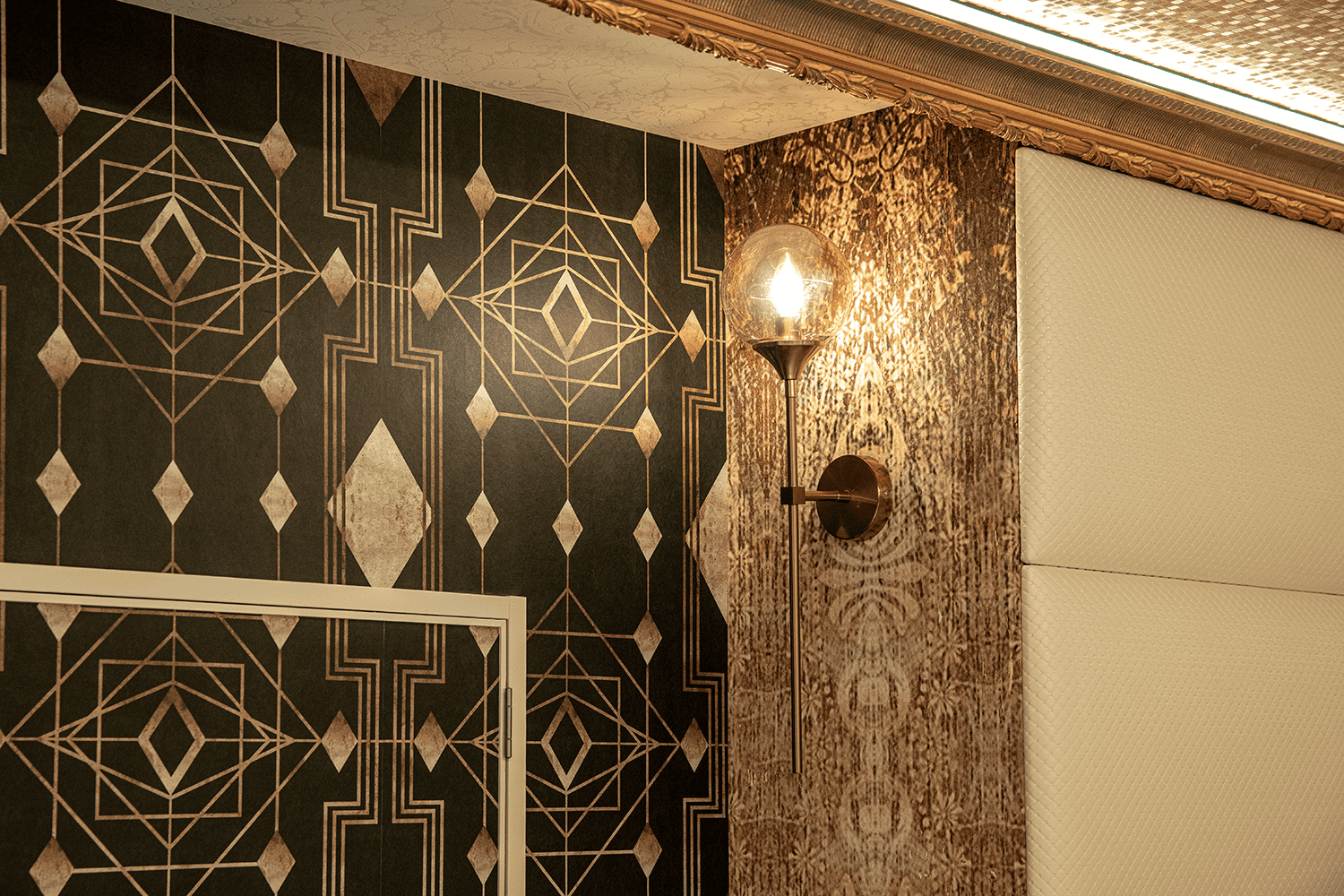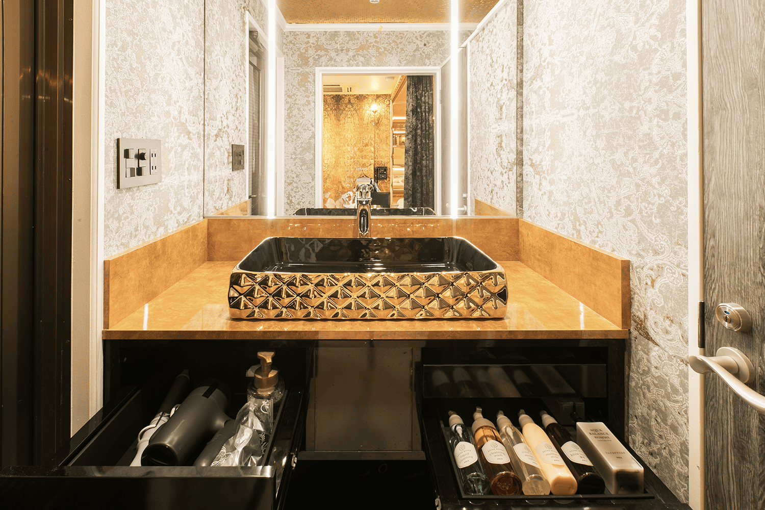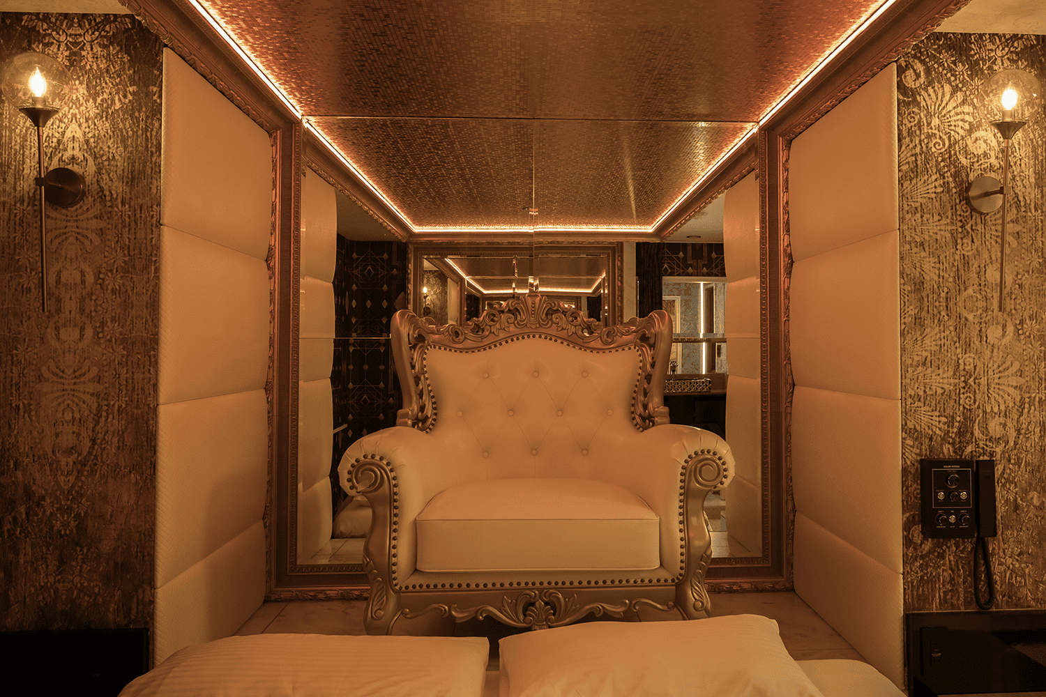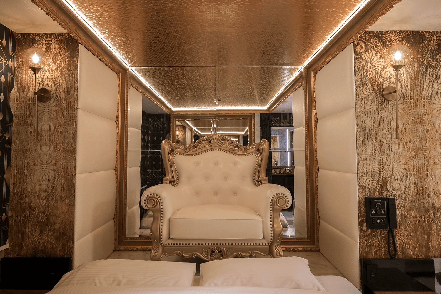 ベッド奥にそびえ立つクレオパトラチェアーは、部屋のシンボルのよう。椅子としてもオブジェとしてもお楽しみください。