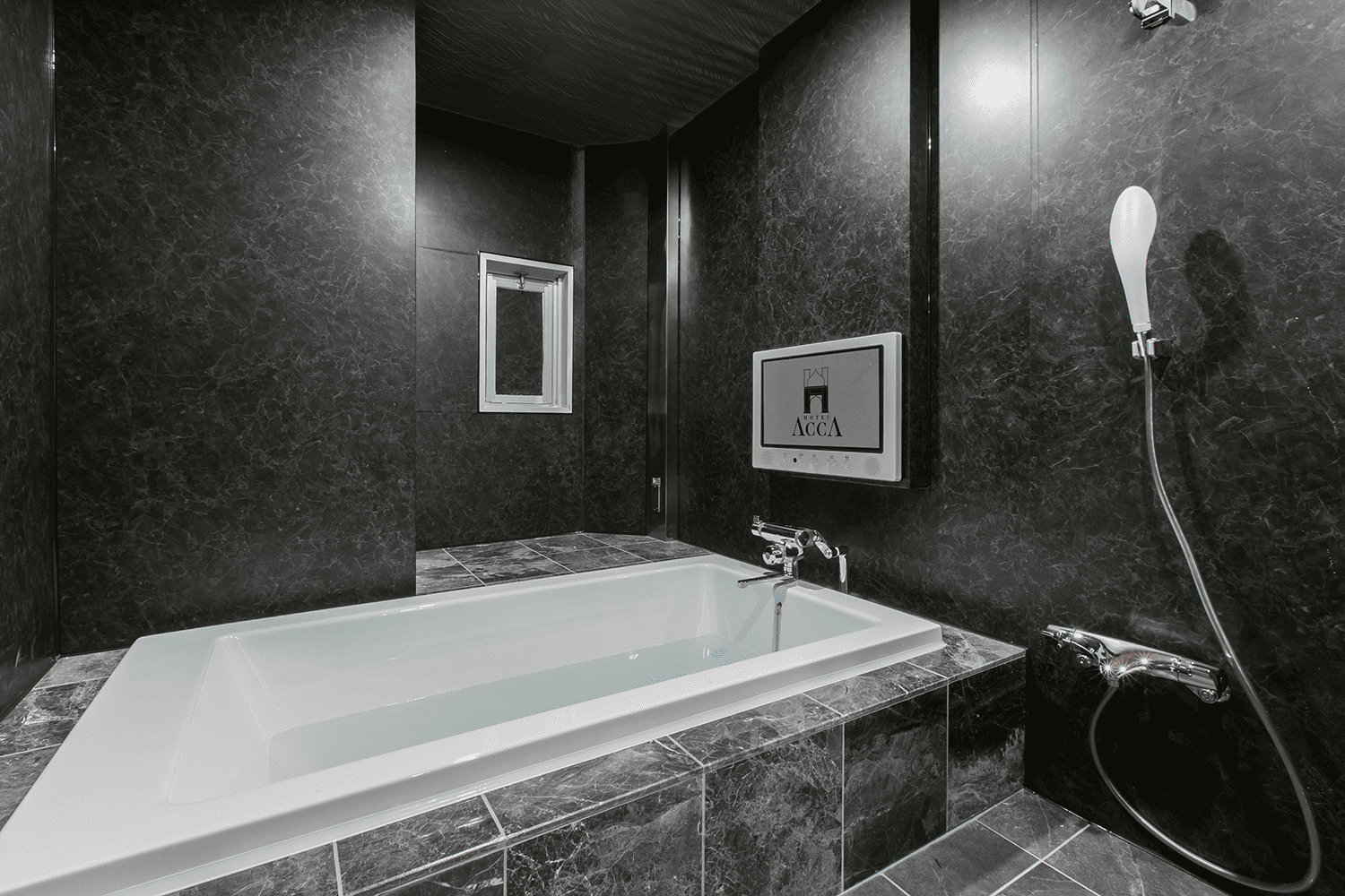 浴室テレビとジャグジー、頭皮や肌に優しいシャワーヘッドも完備。入浴中もTV鑑賞をお楽しみいただけます。 -